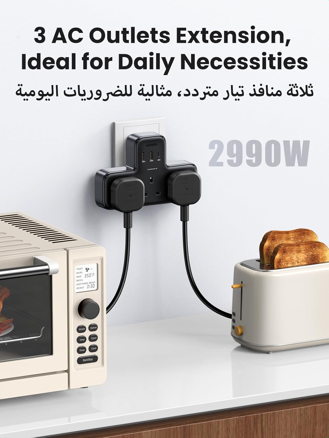 پریز برق UGREEN 6 در 1 یک راهحل جمعوجور برای شارژ همزمان تا 6 دستگاه است. این افزونه دارای 3 پریز AC نوع G با توان تا 2990 وات و سه پورت USB شامل یک پورت USB‑C با شارژ سریع PD30W و دو پورت USB‑A است. طراحی بدون کابل و پلاگ UK، مناسب برای آشپزخانه، دفتر یا کنار میز کار است و با فیوز 13 آمپر و محافظ ولتاژ از دستگاهها در برابر نوسانات برق محافظت میکند. فناوری GaN در شارژر باعث کاهش حرارت و افزایش بازده شده و دو پایه قابل تنظیم پشت دستگاه پایداری بیشتری فراهم میکنند. انتخابی مناسب برای کسانی که به دنبال ترکیب شارژ سریع و صرفهجویی در فضا هستند.
